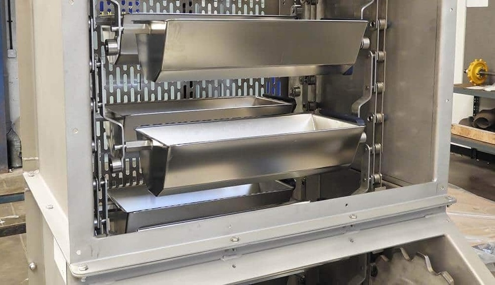 Designed for vertically lifting materials. Controlled discharge using mechanical or hydraulic systems. Common in vertical conveyors for bulk materials.